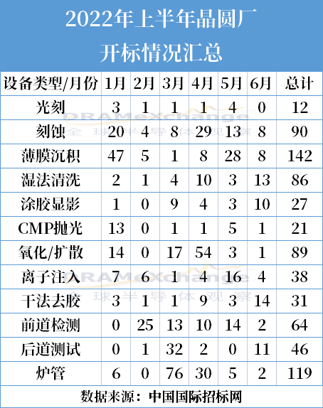 從開標數(shù)據(jù)看,2022 年上半年國內(nèi)主要晶圓廠共開標765臺工藝設備,其中清洗設備86臺,數(shù)量排名第五。